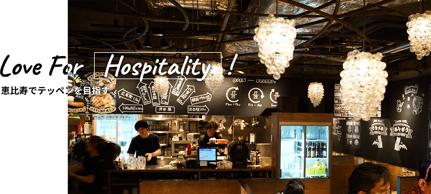 とにかく「美味しいもの」をお客様に届けたい!私たちBLOOMは、韓国料理、お好み・もんじゃなどの鉄板料理、鶏料理、魚料理、豚料理など、恵比寿では目新しい飲食店を次々に展開してきました。共通しているのは、気軽に立ち寄れる空間をつくること。お客様がリラックスできる、お店の雰囲気づくりを心がけています。
